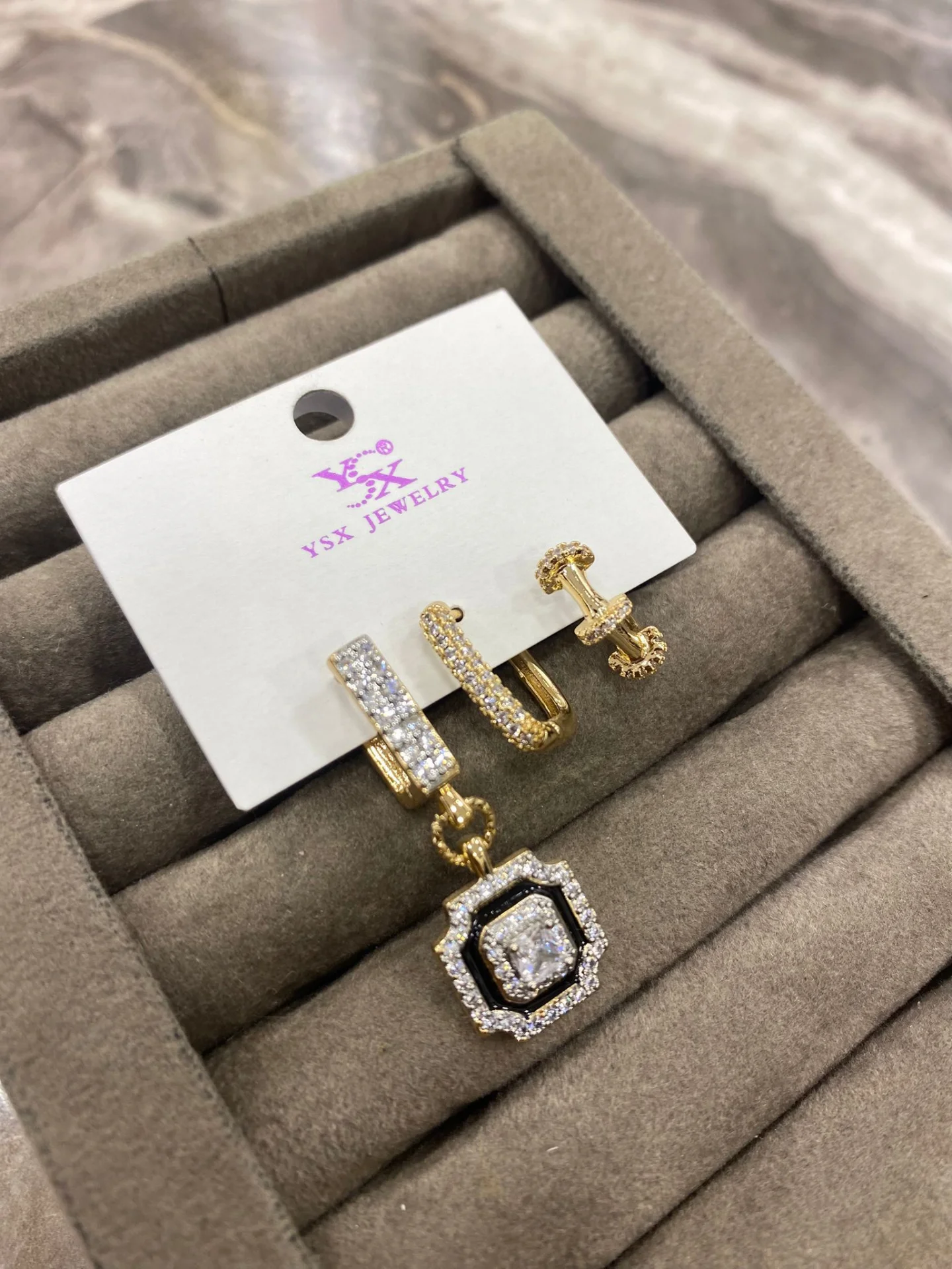 Zarif ve ışıltılı detaylarıyla dikkat çeken bu altın renk küpe seti, günlük ve özel kombinlere kolayca uyum sağlar. Paslanmaz çelik altyapısı sayesinde kararma yapmaz, uzun süre parlaklığını korur. Sallantılı kare taş detayı modern ve göz alıcı bir duruş sunarken, set içindeki diğer taşlı modellerle şık bir bütünlük oluşturur.