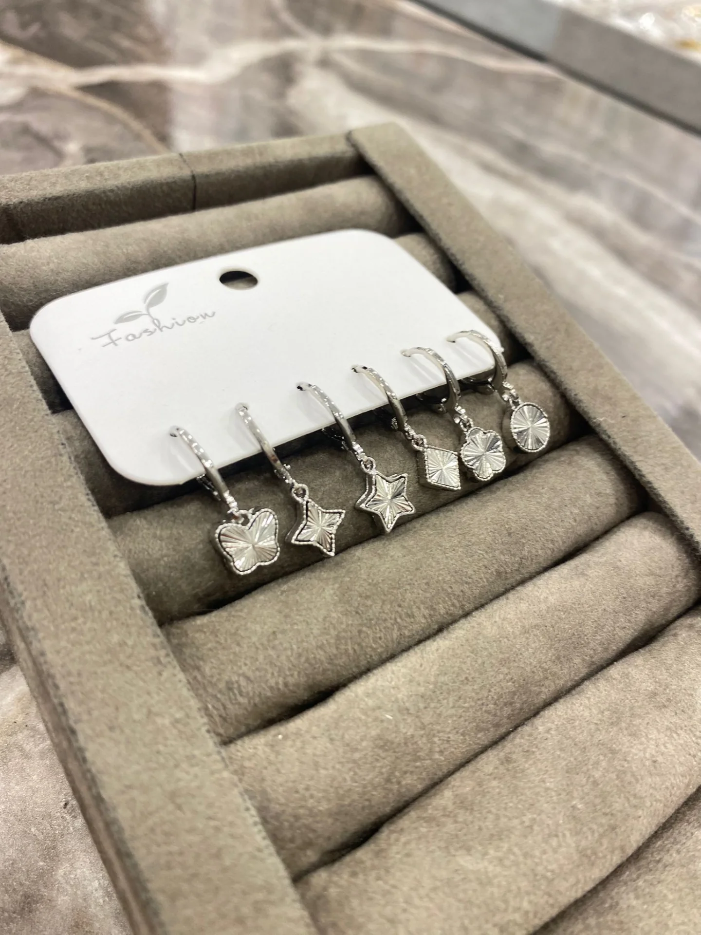 Zarif, şık ve günlük kullanıma uygun gümüş renk sallantılı figür küpe seti.