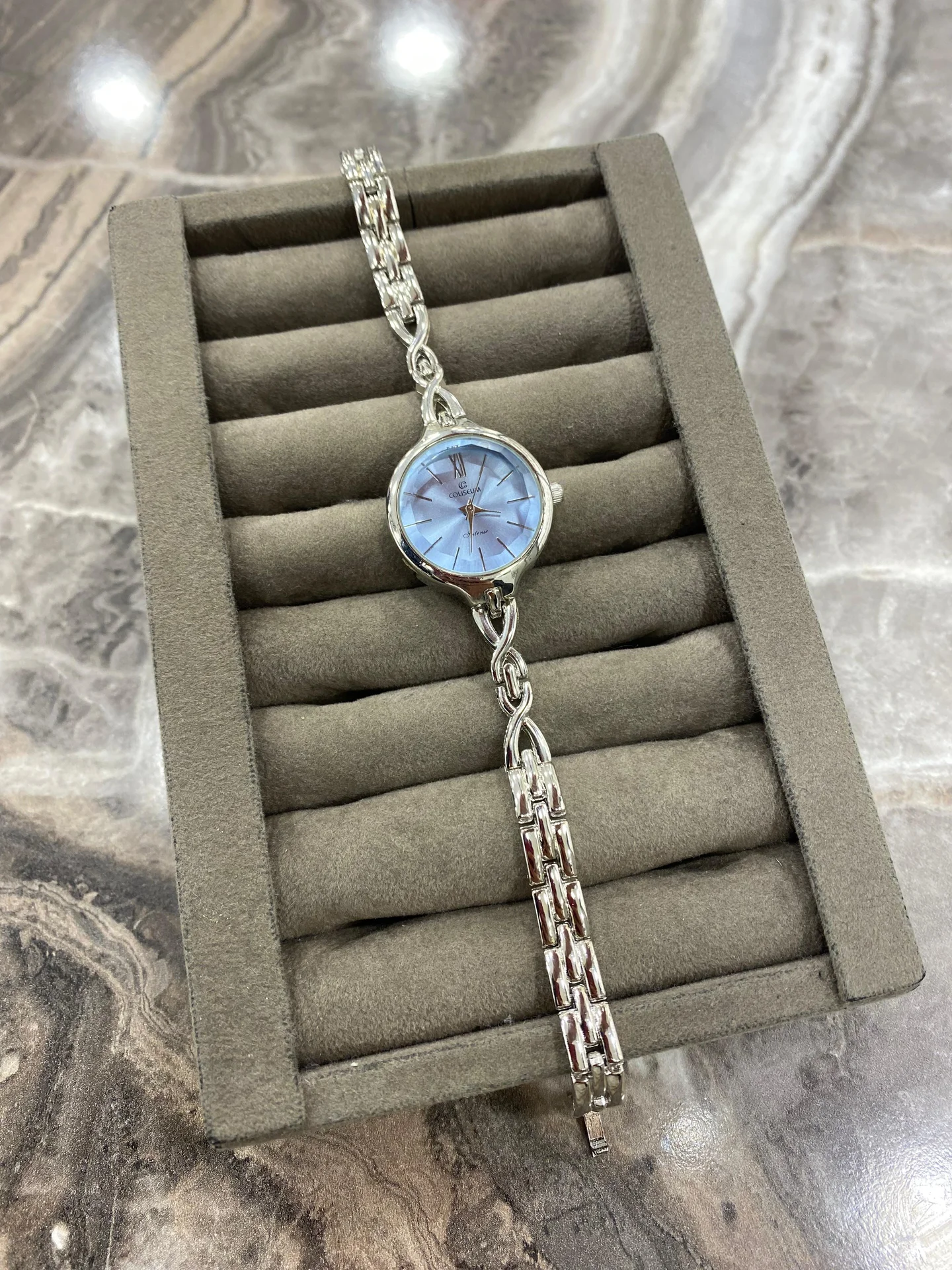 Mavi kadranı ve gümüş zincir kordonu ile modern ve zarif bir görünüm sunan kadın kol saati.