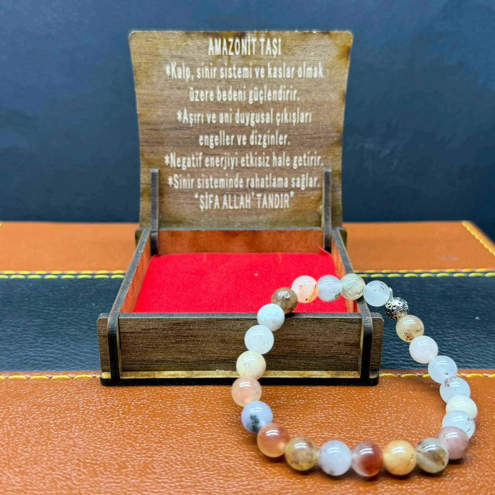 Özel Ahşap Kutulu Amazonit Taşı Bileklik – Küre Kesim 8MM