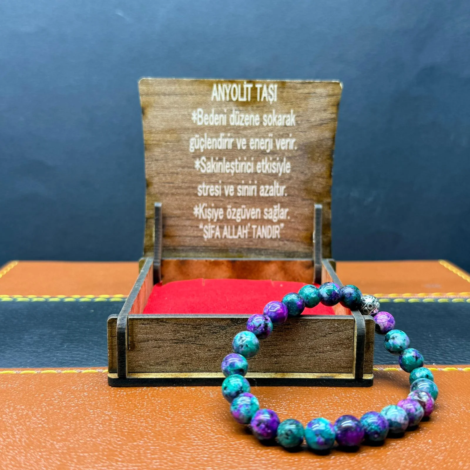 Anyolit, yeşil Zoisit taşı ile mor Rodokrozit taşının birleşiminden oluşan nadir ve göz alıcı bir mineraldir. Canlı renk kombinasyonu ve güçlü enerji frekanslarıyla ruhsal dengeyi destekler, duygusal blokajları çözer. Özellikle yenilenme, şifa ve pozitif dönüşüm için tercih edilir.