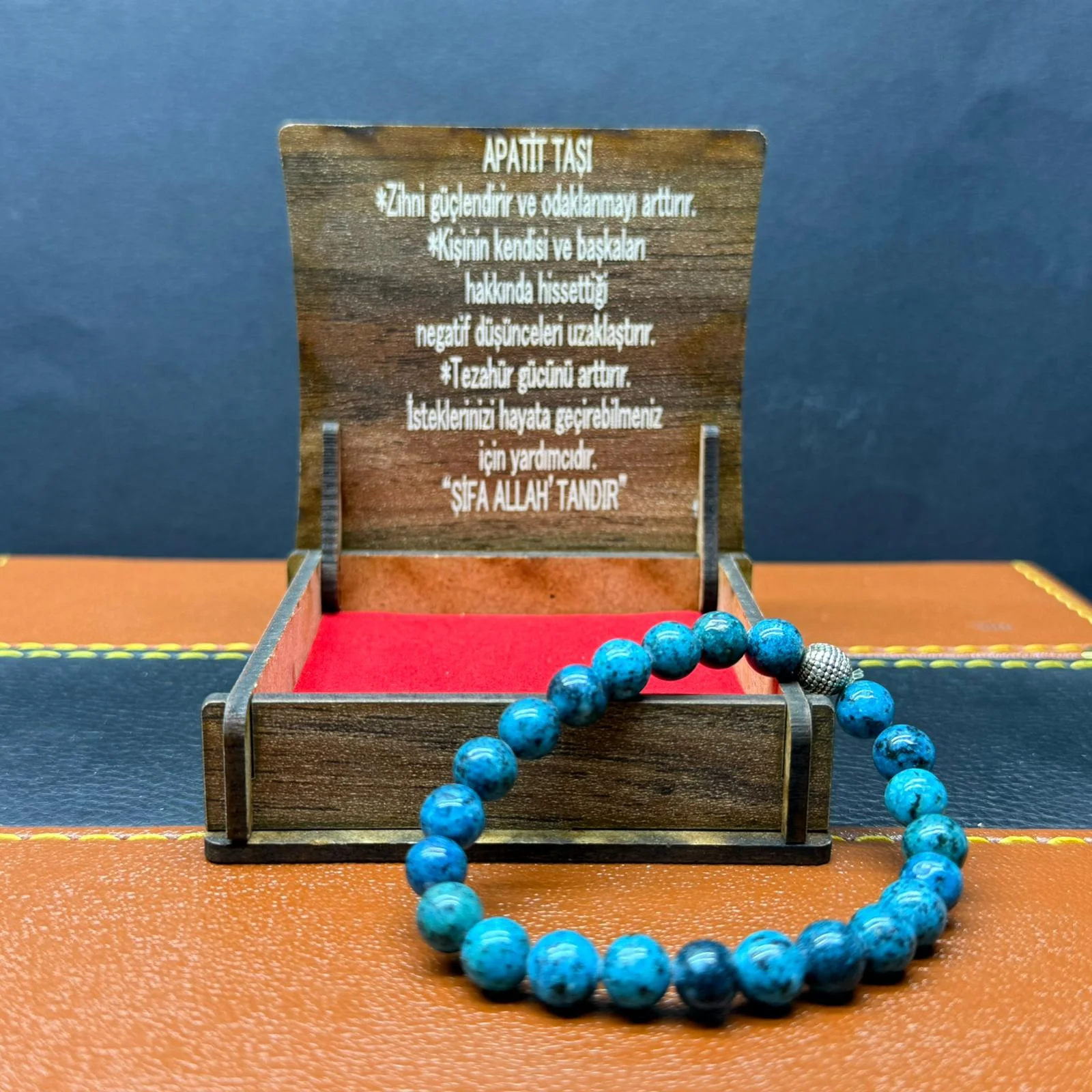 Özel Ahşap Kutulu Apatit Taşı Bileklik – Küre Kesim 8MM