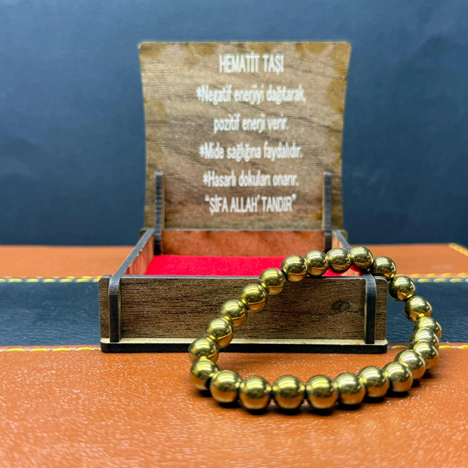 Özel Ahşap Kutulu Gold Renk Hematit Taşı Bileklik – Küre Kesim 8MM