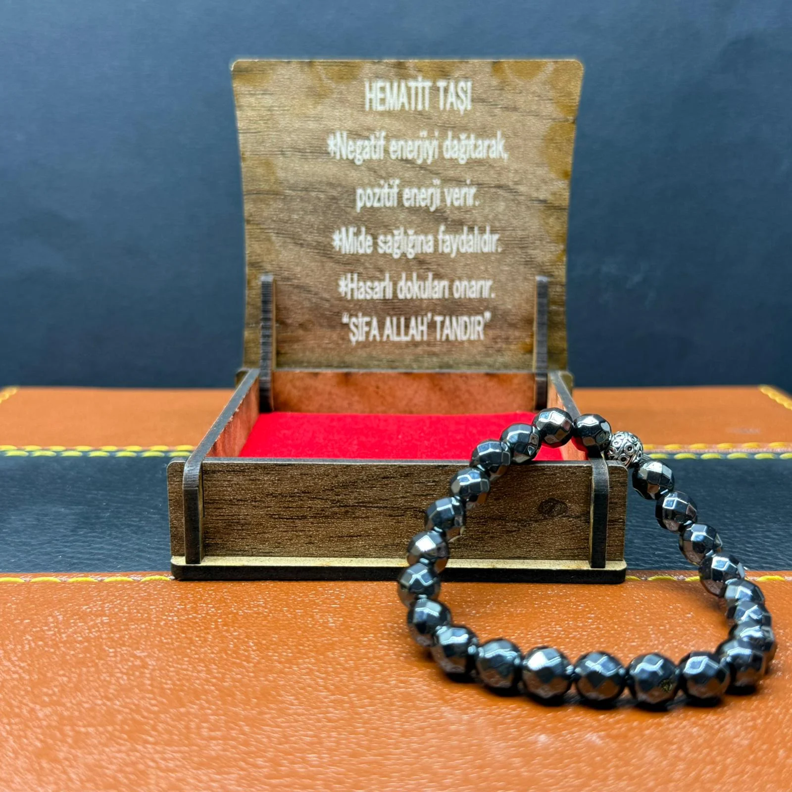 Özel Ahşap Kutulu Hematit Taşı Bileklik – Küre Kesim 8MM