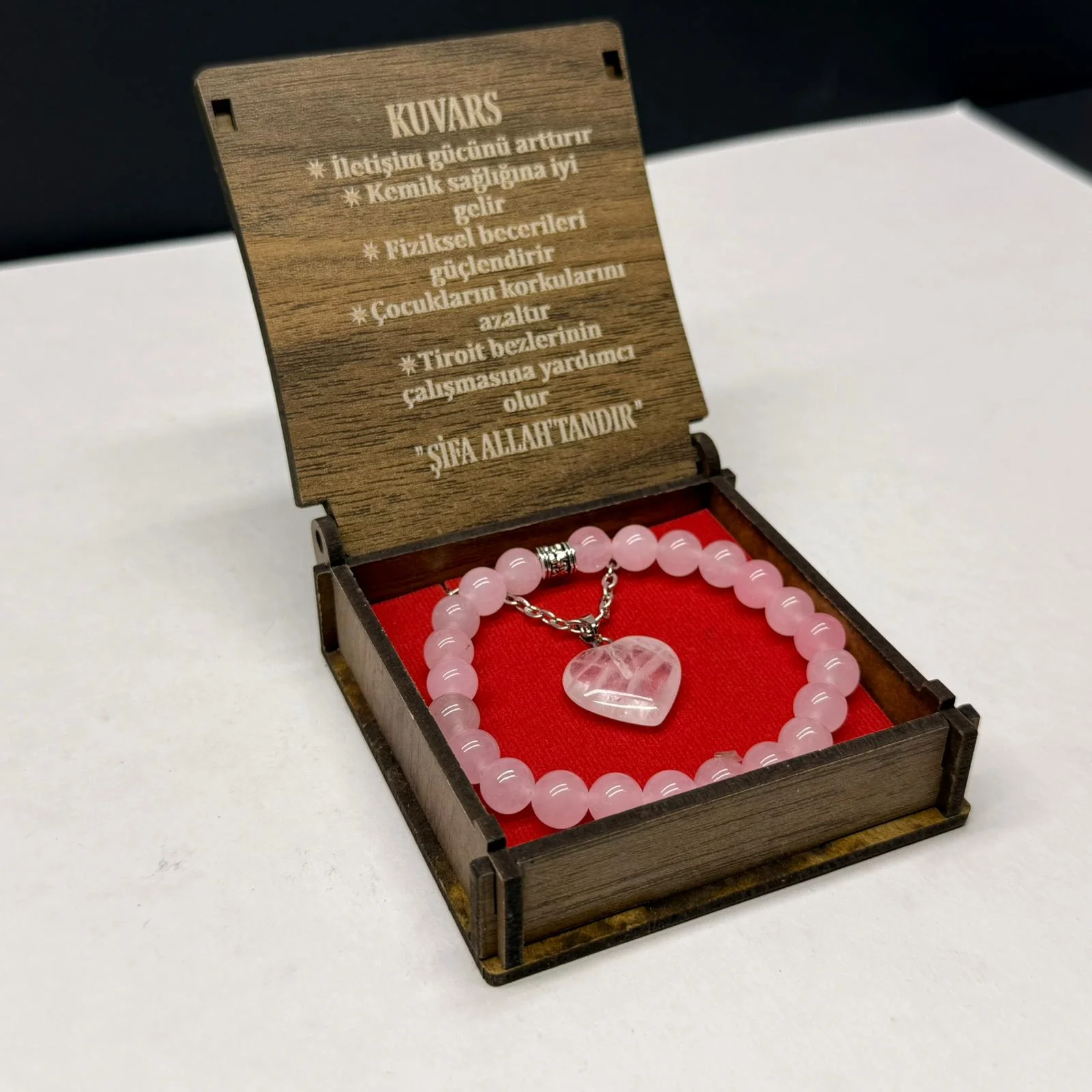 Özel Ahşap Kutulu Pembe Kuvars Taşı Bileklik Kolye Seti
