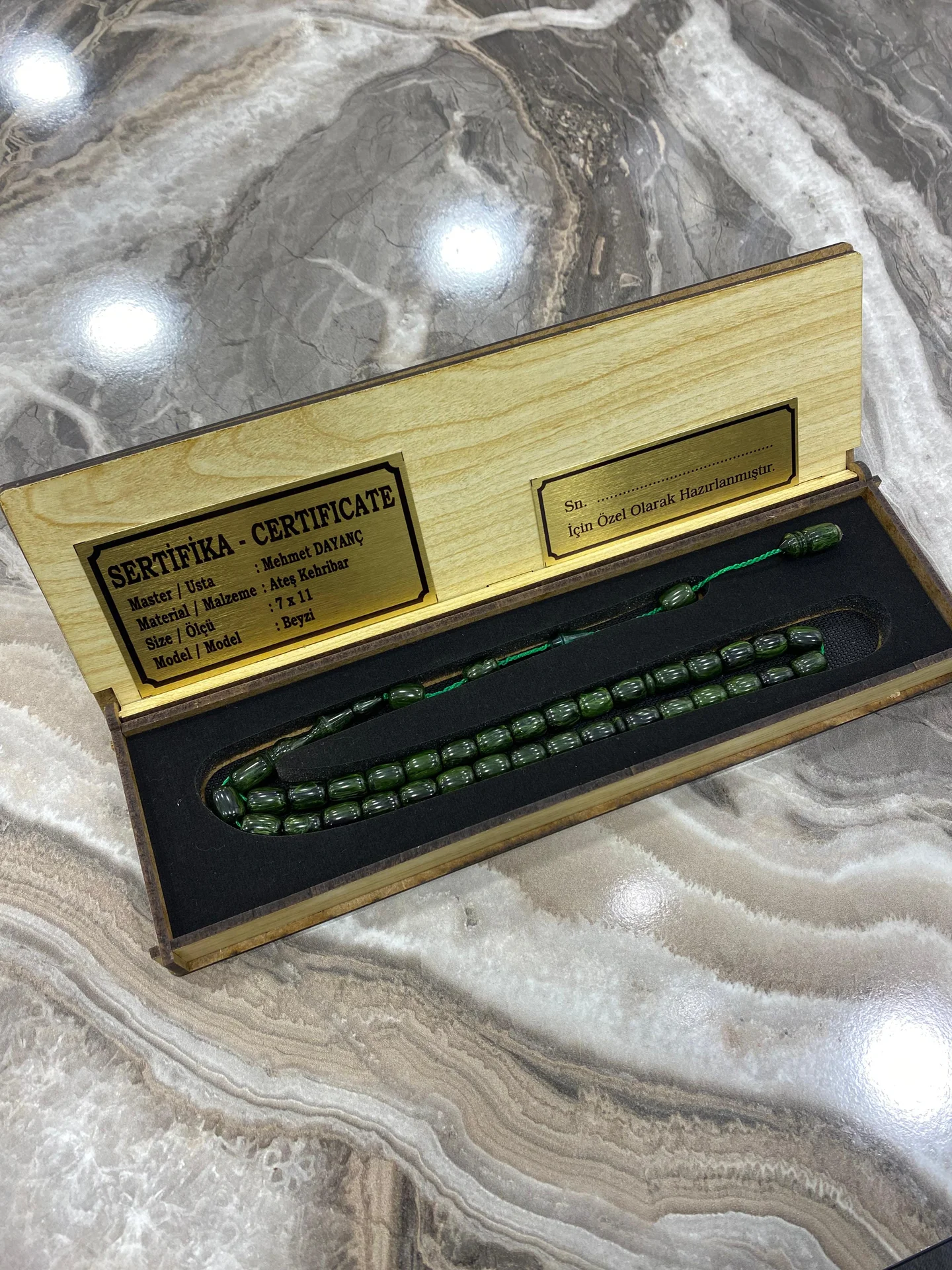 - Sertifikalı Ateş Kehribar Tesbih – Kişiye Özel Ahşap Kutulu