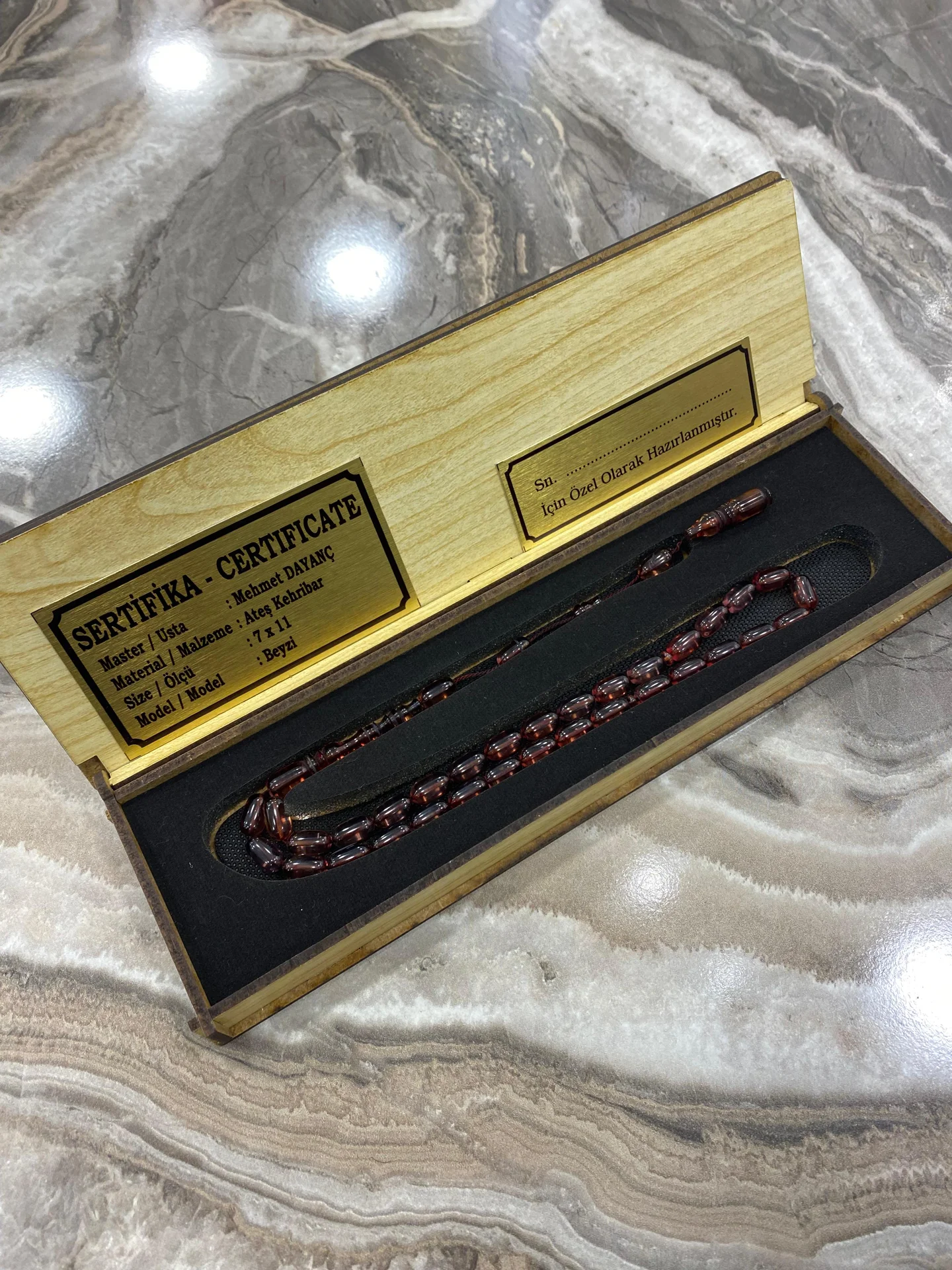 Usta işçilikle hazırlanan bu sertifikalı ateş kehribar tesbih, derin bordo tonları ve pürüzsüz yüzeyiyle kaliteyi net şekilde hissettirir. Ahşap kutu içerisinde yer alan sertifika plakası ve kişiye özel isim alanı ürüne hem güven hem de ayrıcalık kazandırır. Dengeli dizilimi sayesinde elde rahat bir kullanım sunar. Koleksiyon değeri taşıyan bu özel parça; babaya, eşe, dostlara ve özel günlerde fark yaratmak isteyenler için ideal bir hediyedir. Şık sunumu ve sertifikalı yapısıyla uzun yıllar değerini koruyacak, özel bir tesbihtir.