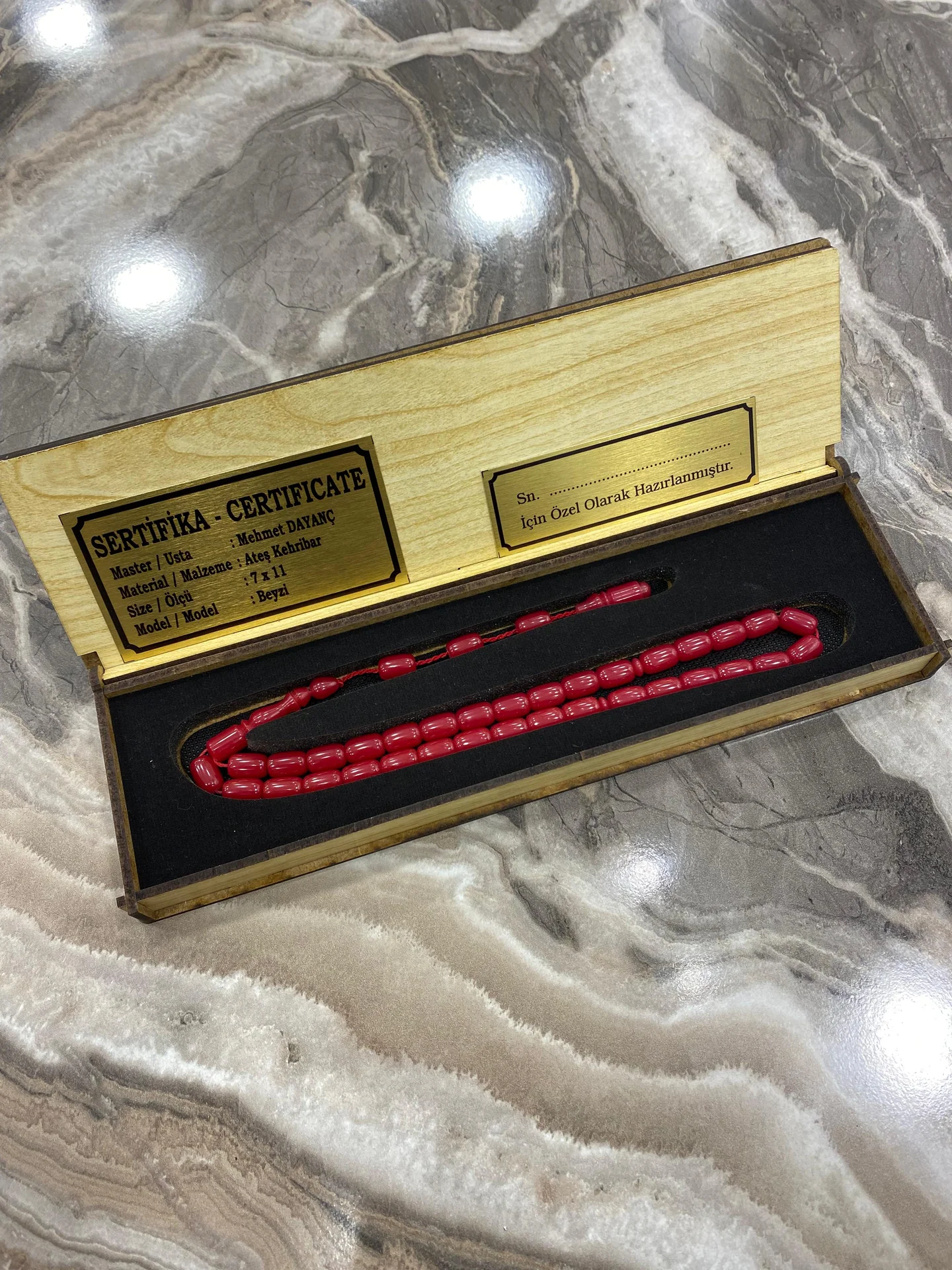 - Sertifikalı Ateş Kehribar Tesbih – Kişiye Özel Ahşap Kutulu (Kırmızı)