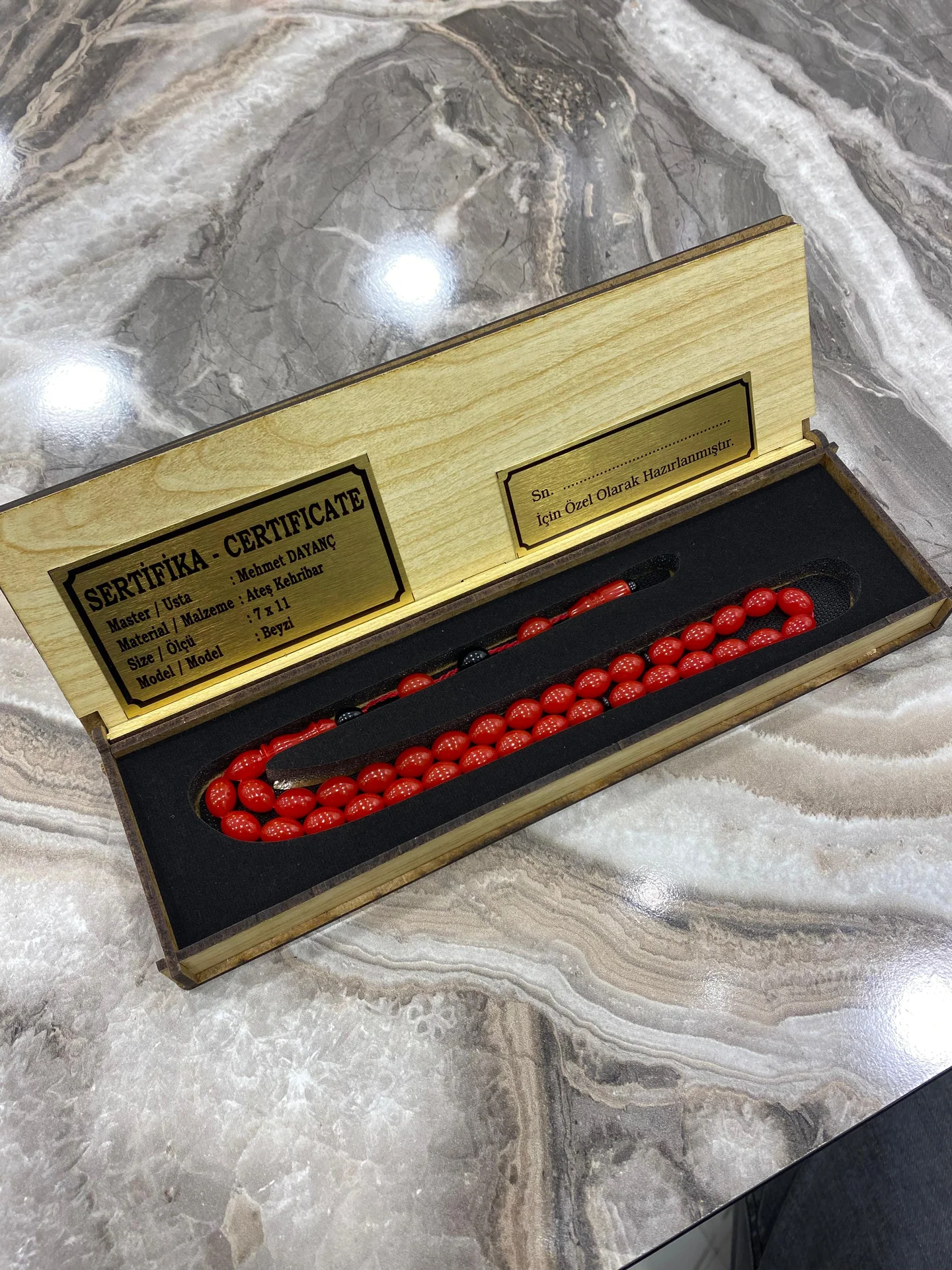 Tesbih, iç kısmı siyah kaplamalı özel ahşap saklama kutusu içerisinde gönderilmektedir. Kutunun iç bölümünde sertifika bilgileri yer almakta olup, ürünü korumaya ve düzenli şekilde muhafaza etmeye yardımcı olur.