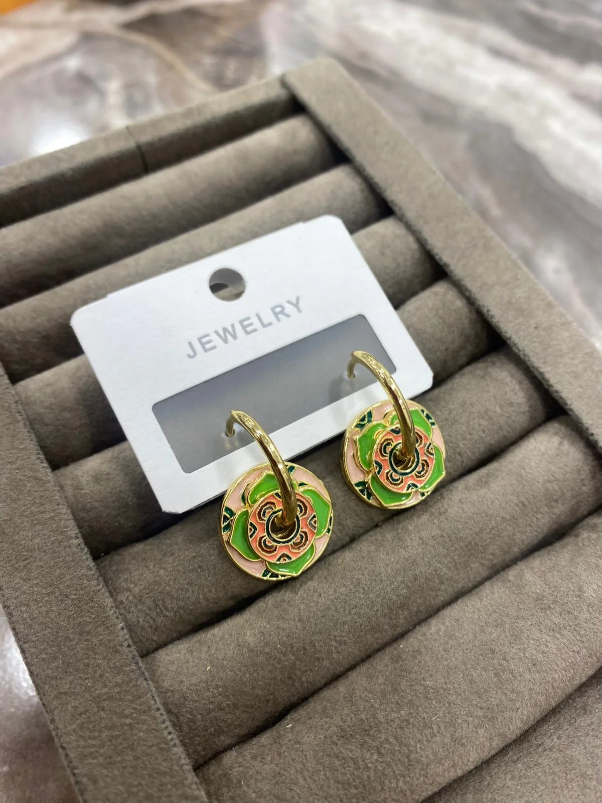 Altın renk halkası ve canlı yeşil–pembe çiçek motifiyle tasarlanan bu sallantı küpe, hem günlük hem de şık kombinlere uyum sağlar. Renkli detaylarıyla tarzınıza enerjik ve dikkat çekici bir dokunuş katar. Hafif yapısı sayesinde gün boyu rahatça kullanılabilir. Farklı ve özgün aksesuar sevenler için ideal bir modeldir.